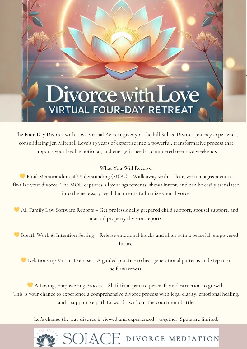 Disclaimer: Use of this website and its materials does not create an attorney–client relationship with Jen Mitchell Love, Solace Divorce Mediation, Inc., or Solace University. All content provided is for general informational purposes onlyand is not legal advice. You should consult with qualified legal counsel regarding your specific circumstances before making any legal decisions.